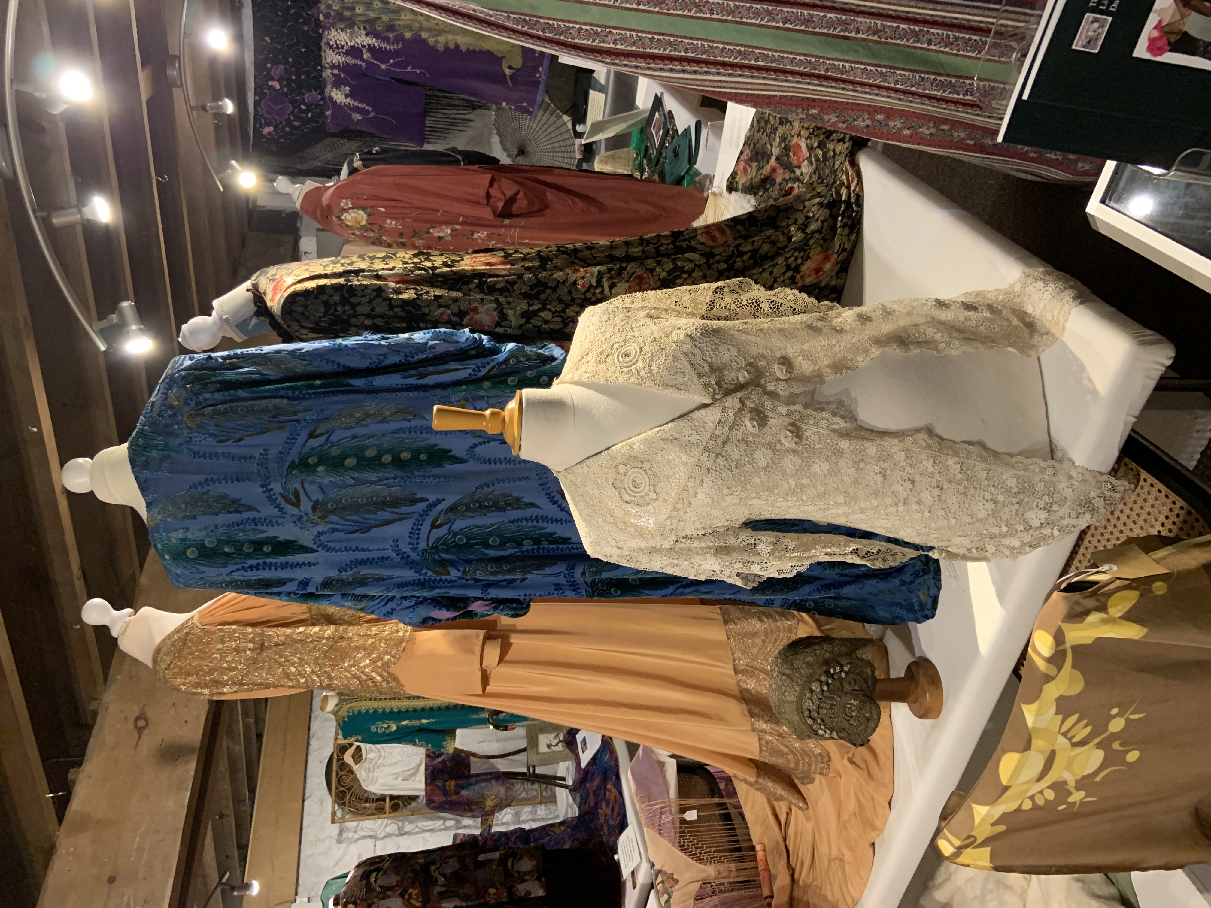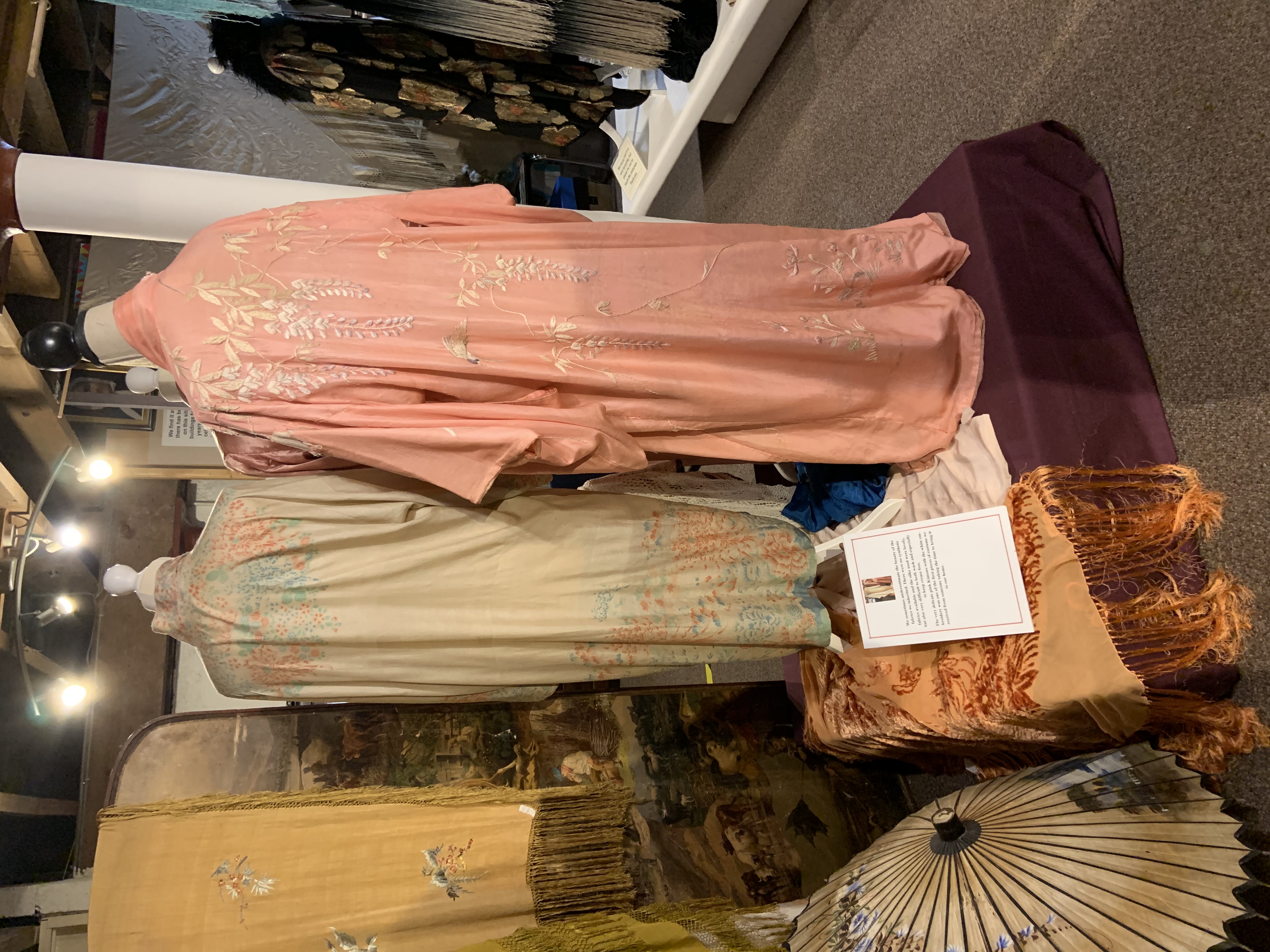 Brought from upstairs to replace the very successful Kimono exhibition it featured fabulous “piano” shawls and other pieces of special value or which we have collected and greatly admire.